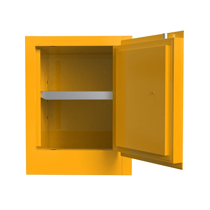 Назив производа: Запаљиви ормар за складиштење Модел производа: ГС004 Спољне димензије: В560×Ш430×Д430мм Унутрашње димензије: В460×Ш350×Д330мм Димензије полице: Ш348×Д330×В25 мм Запремина: 4/15 (галони/литри) Тежина: 25 кг Начин отварања врата: ручно/аутоматски Полице: Једна подесива полица Тип врата: Једнокрилна врата Уређај за закључавање: Двоструке браве Боја: жута (спреј од епоксидне смоле - фарбано) Напомене: Према боцама реагенса од 500 мл, могу се поставити 2 полице, са 9 боца на свакој полици |